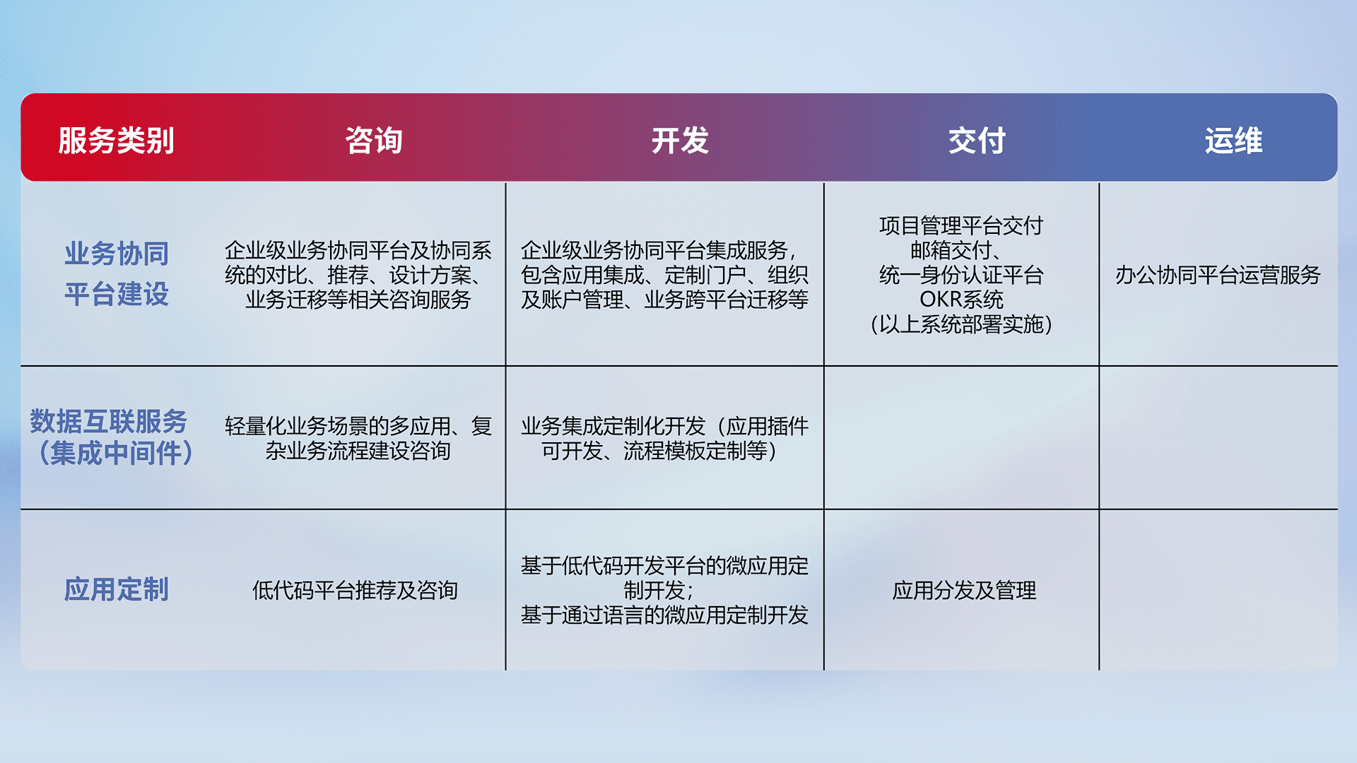 针对钉钉、、、、企微、、IDaas等平台级产品提供产品的规划、、方案、、交付、、定制化开发等服务,,,,实现如统一协同办公、、智能客户服务、、、、混合会议管理、、智能数据查询、、、等业务场景,,,实现数字化转型。。。。