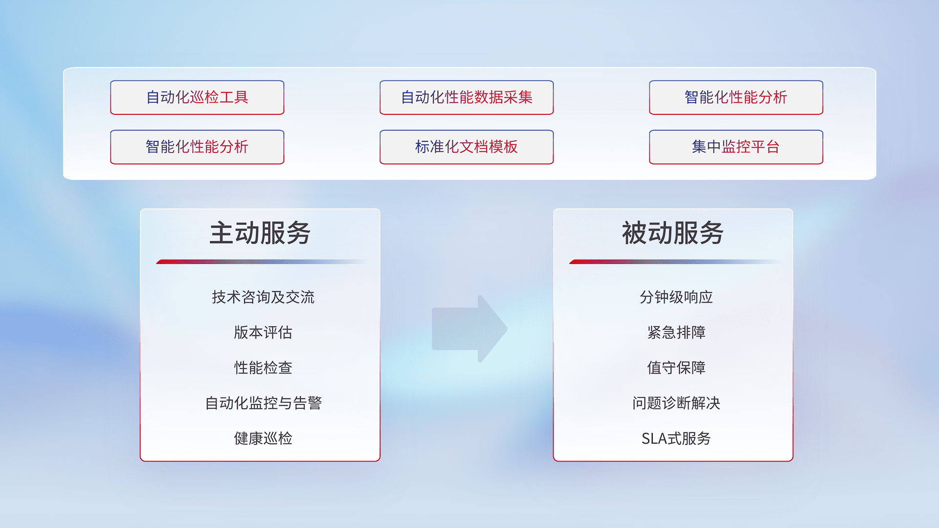 智能化工具和标准化文档,,保障服务质量,,提供主动服务(包含技术咨询、、、、版本评估、、性能检查、、、、自动化监控与告警、、健康巡检)和被动服务包含(分钟级响应、、、紧急排障、、、值守保障、、问题诊断解决、、、、SLA服务)。。